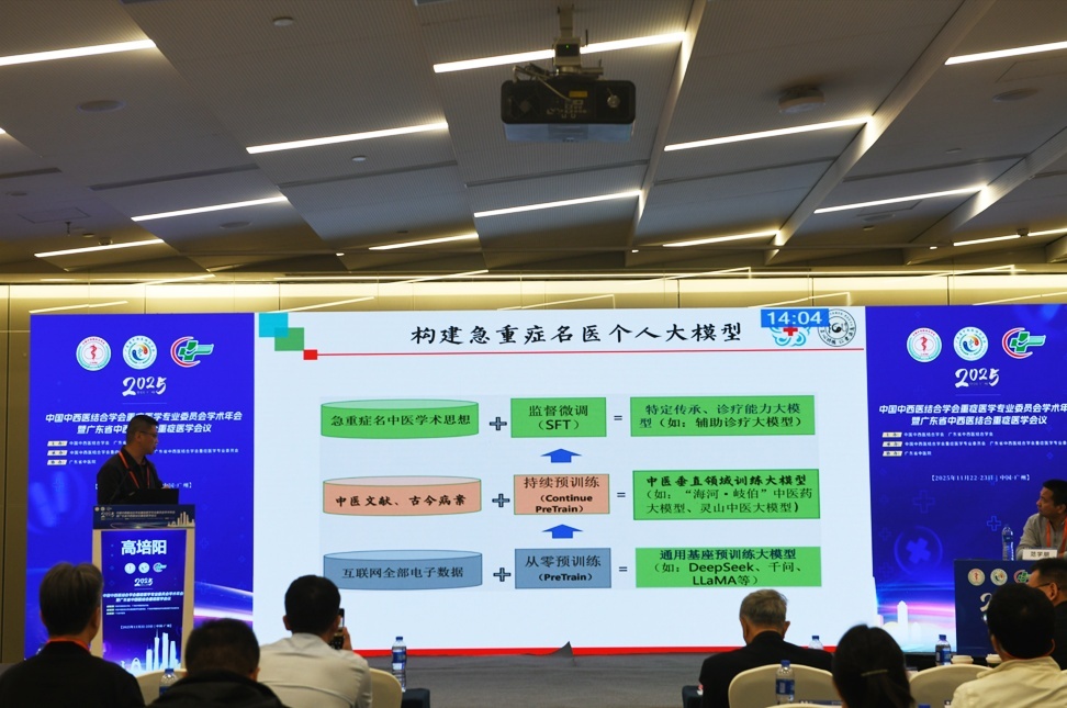 而AI技术与中医的融合,为解决传承难题提供了绝佳思路。其背后的关键逻辑是,通过AI技术将经验转换为可视化的精准数据。高培阳提出,可通过AI技术,分三个阶段构建急重症名医个人大模型。第一阶段是通过互联网数据,构建通用基座预训练大模型;第二阶段是基于中医文献、古今病案持续训练,构建中医垂直领域训练大模型;第三阶段是用急重症名中医学术思想进行监督微调,构建起特定传承、诊疗能力大模型。