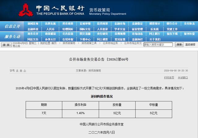 据央行官网消息,2026年4月8日中国人民银行以固定利率、数量招标方式开展了5亿元7天期逆回购操作,全额满足了一级交易商需求。