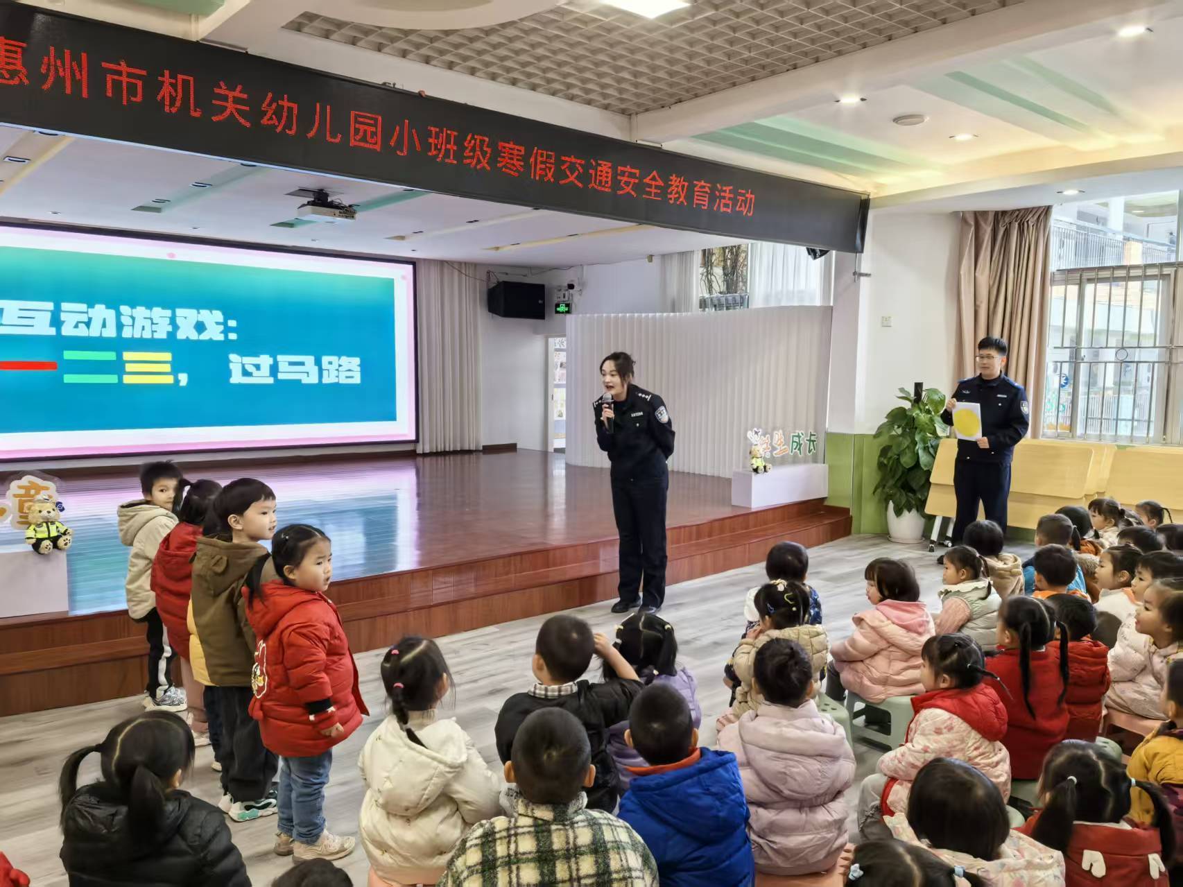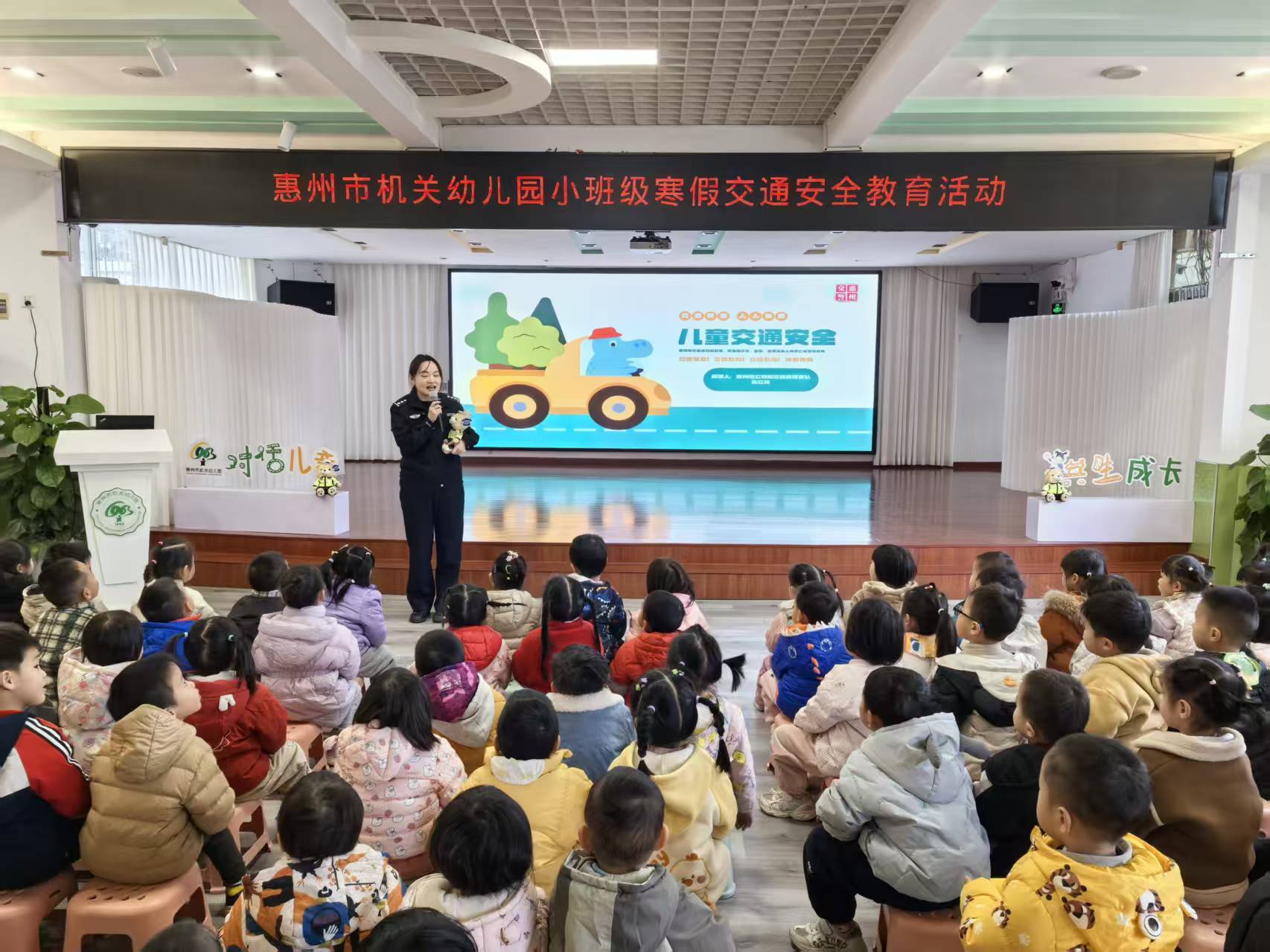 1月22日,惠州市公安局交通管理支队深入惠州市机关幼儿园开展寒假交通安全教育活动,为孩子们送上寒假交通安全“大礼包”。